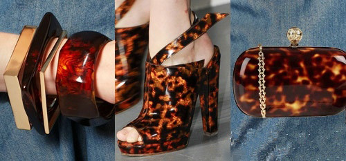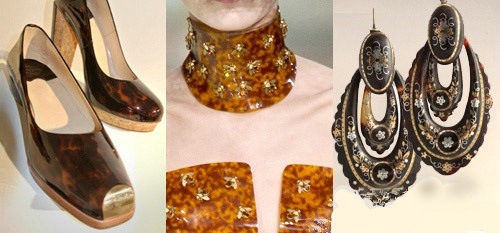堅韌的玳瑁以其獨特的硬度自然的在這個春夏的配飾表現出未來派的金屬質感。Apologie的兩款硬質玳瑁鞋子,嘗試軟木鞋跟與金色斑點的結合。Alexander McQueen 的項鏈和Trocadero的仿古耳飾設計都將女性的細節與玳瑁的堅硬完美結合。